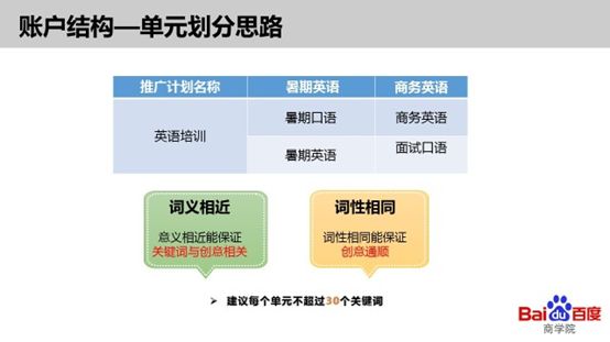 首先要参照计划的思路,细分单元以便逻辑清晰,减少重复。而且更便于后期的管理和评估。其次需要词义相近,结构相同,句式一致,这样做的好处是可以便于商户撰写更相关的创意。有利于创意中嵌入关键词,在搜索结果页吸引网民点击,提高点击率。
